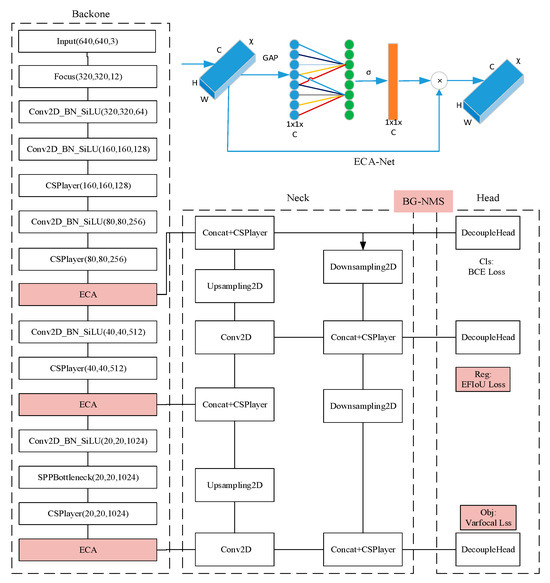 ECA-Net applies global average pooling to the feature maps and conducts local cross-channel interactions using convolution with a specific kernel size, effectively leveraging channel information. The sigmoid activation function is employed to obtain the weight for each channel, and the original feature map is then recalibrated. This recalibration process can either weaken or strengthen specific region features, which proves beneficial for the detection of smaller targets, as shown in the upper right corner of Figure 1.