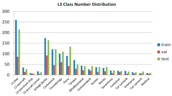 The HRSC2016 dataset is one of the few high-resolution optical remote sensing ship datasets that subdivides ship categories, with three levels of category labeling. The first level (L1) is classified as ships, the second level (L2) is roughly classified as aircraft carriers, warships, merchant ships, and submarines, and the third level (L3) is a detailed classification of each model. We are conducting ship detection for L3. The dataset consists of 1061 images, including 2976 samples. All images are from six famous ports on Google Earth, with a size of 300 × 300–1500 × 900 pixels, with a spatial resolution of 0.4–2 m [36].