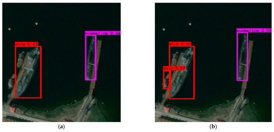 Figure 5 shows a comparison of the detection performance between the NMS approach and the BG-NMS approach. Figure 5a,c shows the detection results using the NMS approach, and Figure 5b,d shows the detection results using the BG-NMS approach. Despite some missed detections (in cases where prediction boxes of two targets overlap completely), the BG-NMS approach reduces instances of missing densely packed targets to some extent. Therefore, the BG-NMS algorithm exhibits better detection performance for densely packed targets.