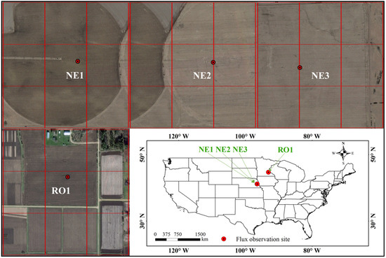 Locations of four flux sites (NE1, NE2, NE3, and RO1) and the MODIS pixel (red lines) with 250 m resolution corresponding to the sites.