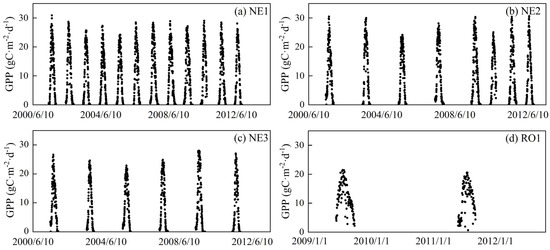 The data set of the RO1, NE1, NE2, and NE3 sites from Fluxnet 2015 provides hourly Tair, net ecosystem exchange (NEE), ecosystem respiration (Re), and SSR. The daily mean, minimum, and maximum Tair (i.e., Tmean, Tmin, and Tmax, respectively); NEE; and Re were computed based on hourly data. GPP was defined by NEE subtracting Re. The emergence and harvest days of three NE sites were obtained from the Carbon Sequestration Project (CSP) of the University of Nebraska (http://csp.unl.edu/public/, accessed on 10 March 2019). The start of season (SOS) and end of season (EOS) of the RO1 site were defined by Zhang et al. [50] with the reconstructed daily NDVI time series by Zeng et al. [51]. Consequently, the NE1, NE2, NE3, and RO1 sites have data availability for 1945, 1276, 987, and 214 days, respectively (Table 1). GPP ranges for four sites are presented in Figure 2.