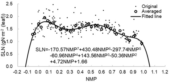 SLN function based on the relationship between SLN and NMP with sufficient data from sites NE1, NE2, and NE3. The dots represent the original data. The hollow circle represents the averaged SLN at an interval of 0.03 NMP.