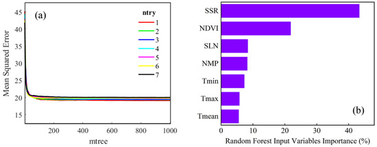 Data from the NE1, NE2, and NE3 sites were used to decide two parameters of RF (mtree: the number of decision trees; ntry: the number of preselected variables for a tree) considering NDVI, SSR, Tmin, Tmax, Tmean, SLN, and NMP as inputs. The gradient of mtree is set to 0~1000, and ntry is set to 1, 2, 3, 4, 5, 6, and 7, respectively. The out-of-bag error was characterized by mean square error (Figure 4).