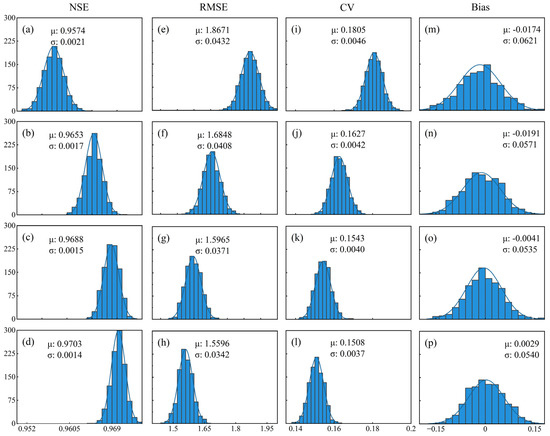 Distribution of evaluation metrics of test results for different combinations (A0: (a,e,i,m); A1: (b,f,j,n); A2: (c,g,k,o); and A3: (d,h,l,p)) using RF in NE1, NE2, and NE3 sites for 1000 running times. μ is the mean value and σ is standard error. The line is the fitted normal distribution curve. The column represents the data number.
