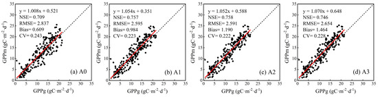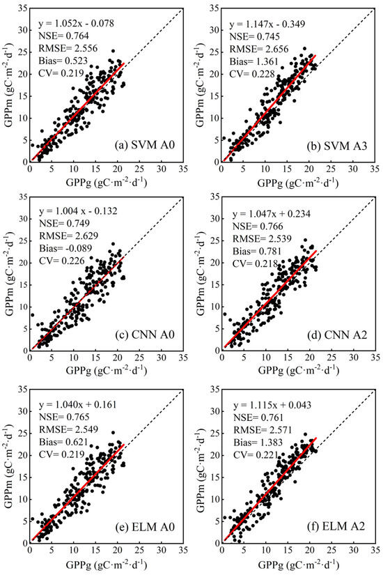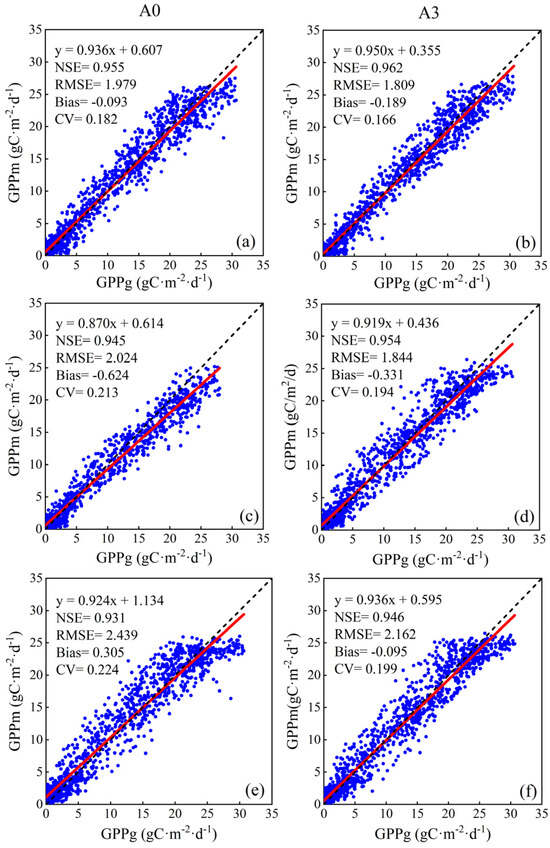Scatter plots of A0 and A3 combinations, respectively, for NE1, NE2, and NE3 sites. (a,b): training in NE1 site and testing in NE2 site; (c,d): training in NE1 site and testing in NE3 site; and (e,f): training in NE3 site and testing in NE2 site. The red line is the fitting line between estimated GPP (GPPm) and ground-measured GPP (GPPg), and the dashed line is the 1:1 line.