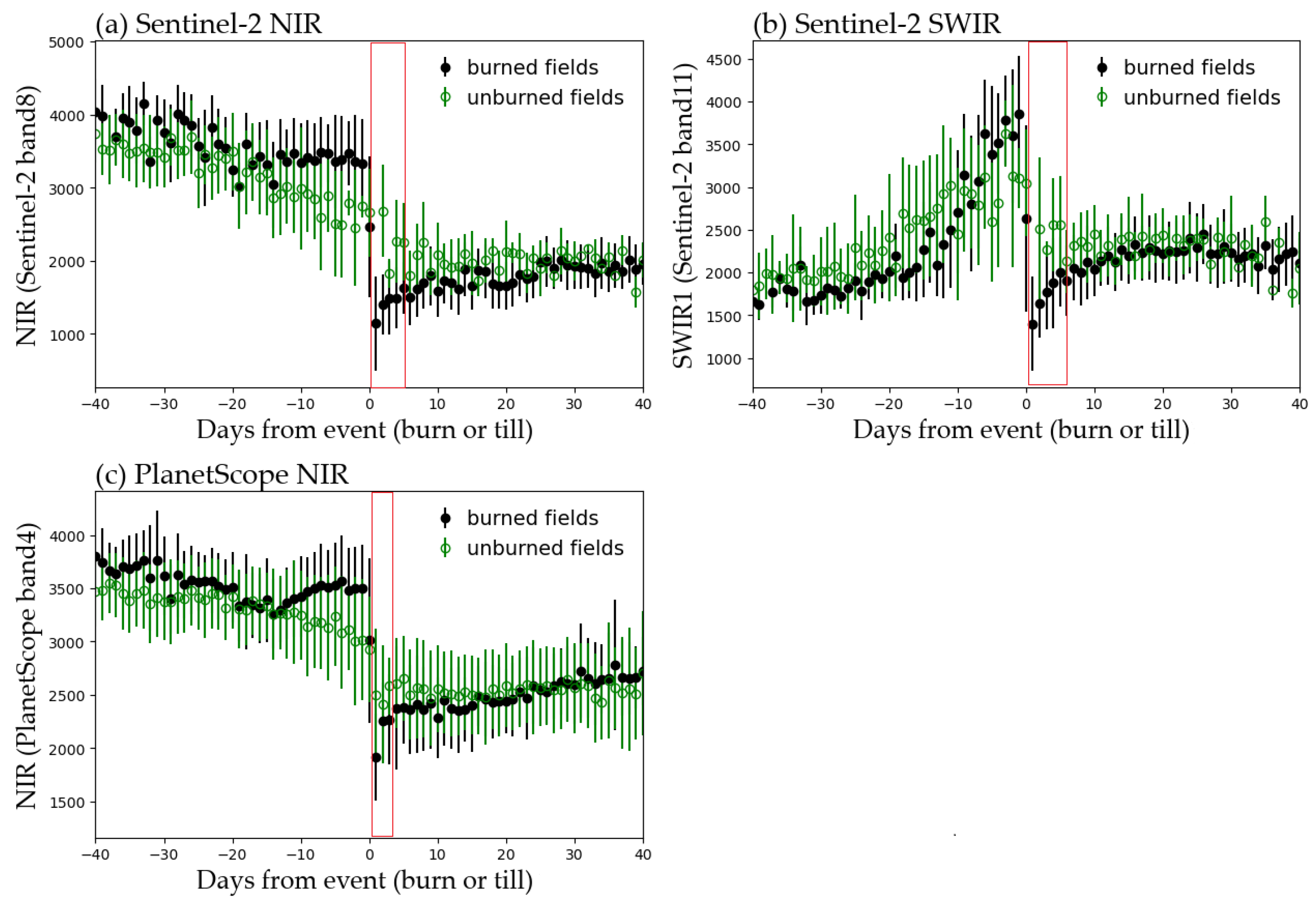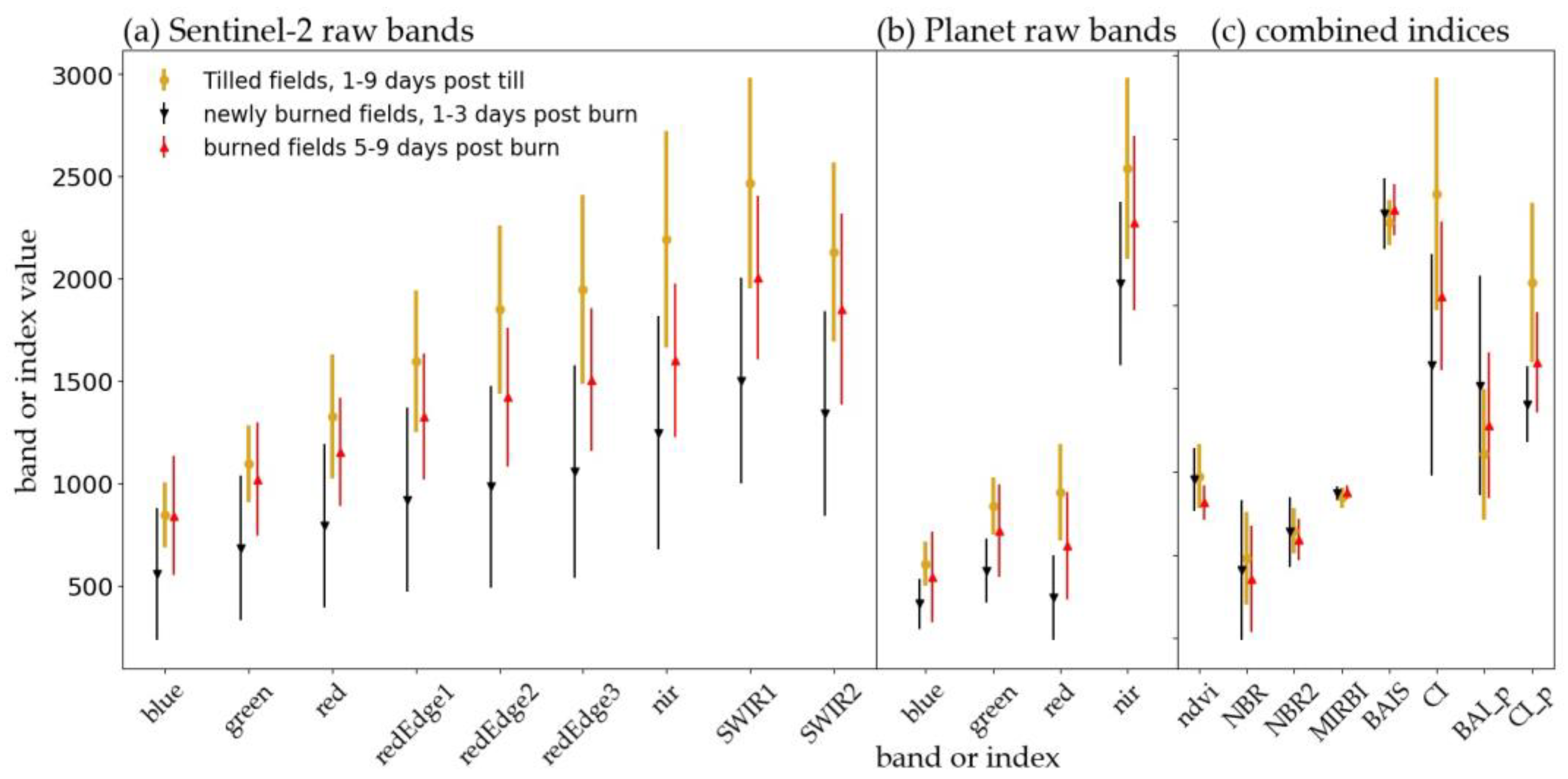 - Deshpande, M.V.; Pillai, D.; Jain, M. Detecting and quantifying residue burning in smallholder systems: An integrated approach using Sentinel-2 data. Int. J. Appl. Earth Obs. Geoinf. 2022, 108, 102761. [Google Scholar] [CrossRef]