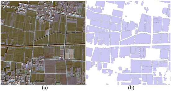 Once the labeling work is complete, the vector graphics are assigned farmland attribute values and rasterized, and finally, the entire image is cropped row by row and column by column with an overlap ratio of 0.1. Afterward, a 512 × 512 binary label file suitable for training is generated as shown in Figure 3.