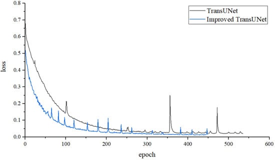 The loss curve of the TransUNet network and the improved TransUNet network.