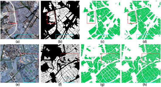 Comparing the segmentation results of the improved network with the original map labels reveals some defects. First, some of the green vegetation close to the residential buildings in the original plan (a) is incorrectly divided into plots in plan (d). Second, in the original map (h), there are also small blocks of residential buildings that are split into plots by the improved network. Third, there is still a gap between the improved network segmentation results and the original map labels in terms of the clarity of the row monopoly and road segmentation between the plots.