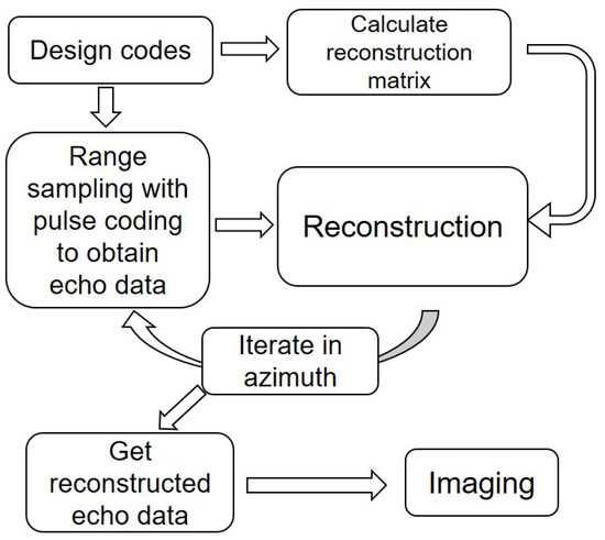 Quasi-continuous waveform coding detection is a method of cooperative detection that combines multiple transmitted pulses of radar. Among them, the number of transmitted pulses, pulse width, frequency bandwidth and the interval between pulses are combined and arranged according to the needs, which is called pulse coding [1,26]. The encoding method can be used in different forms according to the need, for example, the full-band pulse can be used to repeat the transmission many times. The original full-bandwidth single-pulse signal can also be divided into several partial bandwidth pulses and transmitted according to certain rules. The processing of synthesizing the intermittently received echo signal into a complete monopulse echo signal is called echo signal recovery [25]. The realization of pulse coding detection can be intuitively understood as converting an original transmitted pulse into a group of transmitted pulses for detection. This is equivalent to increasing the repetition rate of the transmitted pulse, which has the advantages of high duty cycle and average power, but it may also produce signal occlusion and aliasing problems, which affect the complete acquisition requirements of radar target information. Through the combination coding of multiple pulses, it provides a more flexible and advantageous implementation method for radar [25,27,28]. Different from the common monopulse radar, the radar multi-pulse combination detection needs to introduce the target signal recovery process [29,30]. The flow chart of the probe is shown in Figure 2.