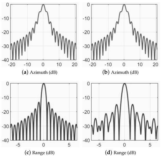 Performance evaluation of point target in Figure 3: (a) azimuth section of point target by traditional method; (b) azimuth section of point target after reconstruction; (c) range section of point target by traditional method; (d) range section of point target after reconstruction.
