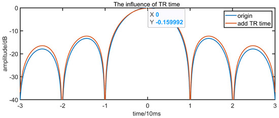 The amplitude and phase of the recovered echoes were compared with or without the transceiver conversion. Due to the existence of transmit–receive conversion time, the power of the recovered echo appears to decrease in some moments, but the phase does not change. Pulse compression is performed on the echoes in both cases, and the comparison figure is shown in Figure 12. It can be seen that the gain of pulse compression results is reduced by about 0.16 dB due to the existence of transmit–receive conversion time.