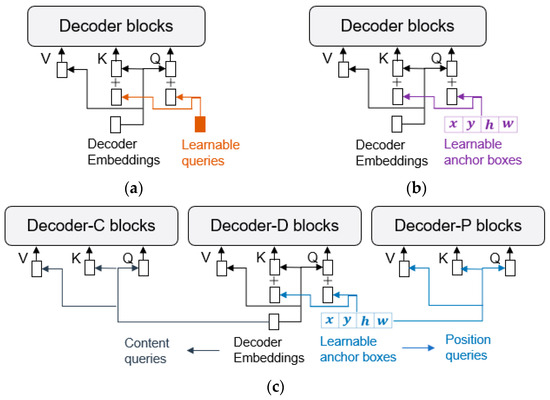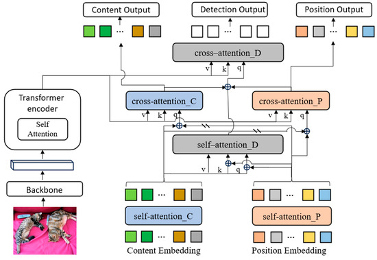Joint learning of content and position: The core of our method is the object detection decoder based on the DETR-like model. By querying, object queries are used to query the feature map and learn to obtain the information required for the object detection task, as self-attention_D and cross-attention_D blocks are shown in Figure 2.