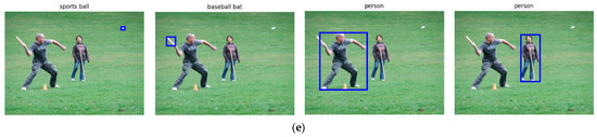 The detection results in Figure 4 show that our model provides better detection and localization results for small objects on the COCO dataset. At the same time, the baseline method [10] either misses or inaccurately locates some of these objects, such as those in the red box in Figure 4b. Compared with baseline results, our method better detects small objects in the red box area where smaller objects exist without specifically training or fine-tuning the small object dataset. Usually, the detection of small objects requires a better understanding of the details of the image [23], so by analyzing the above small object detection results, our model has a better understanding of the content and details of the image, which is due to our auxiliary independent learning and emphasis on the content information and location information of the image. Also, reflecting the separate stages of content learning and location learning in our model (as described in Section 3.3 and Section 3.4) enhances the model’s ability to capture complex details of the object.