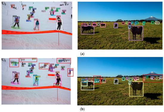 Comparison of detection results on sample images containing small objects from the COCO dataset. We used the visualization method in [26] to output prediction results and comparisons. (a) Baseline method [10]. (b) Proposed method: the red box is the small object area that our proposed method detected but was missing in the baseline method.