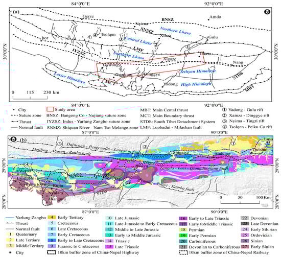 Overview of the study area. (a) Geographical location and geotectonics []; (b) geological maps and the distribution of major faults.