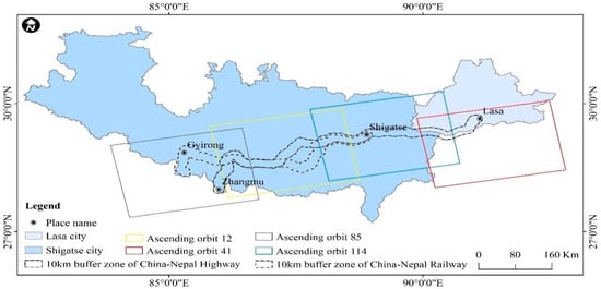 The China–Nepal Transport Corridor is a road for economic development and is vital to the country’s efforts to build a land trade route in South Asia and promote the Ring-Himalayan Economic Cooperation Belt. It consists of the China–Nepal Highway (an existing road) and the China–Nepal Railway (a planned railway). The China–Nepal Highway starts in Lhasa and ends in Kathmandu, the capital of Nepal. The 829 km Chinese section passes through Qushui County, Shigatse City, Lazi County, Tingri County, and Zhangmu town, ending at the Friendship Bridge. The 540 km Chinese section of the China–Nepal Railway starts from Shigatse City in the east, passes through Saga County, Tingri County, and Gyirong County, and ends at Gyirong Port (Figure 1b). The study area is located in the southern portion of the Qinghai–Tibet Plateau, passing from north to south through three secondary tectonic units: the Lhasa Block, the Himalayan Blocks, and the YarlungZangbo River suture zone []. Strong compression of nearly north-south tectonic stress causes the boundary faults of tectonic units at all levels to predominantly strike east-west []. These faults are generally characterized by a long extension distance, large cutting depth, fault fracture bandwidth, and multistage activity []. Moreover, river downcutting and freeze-thaw erosion are intense []. Therefore, disastrous landslides are possible in the region due to the coupling of internal and external dynamics [], which threatens the safe operation of the China–Nepal highway and the construction of the China–Nepal railway. Due to the fragile geological environment of the China–Nepal transport corridor, climate warming may contribute to an increase in the frequency and probability of landslide disasters in the study area, manifested in the resurgence of old landslides and the induction of potential landslides. At present, scholars are concentrated on the structural characteristics, deformation monitoring, and stability assessment of specific landslides along the China–Nepal transportation corridor [,,]. In addition, research on the interpretation, development characteristics, and driver factors for historical landslides in the local areas has been conducted using a single remote sensing interpretation or field survey method [,,]. However, there is a lack of systematic research on the distribution and causes of landslides (old landslides and potential landslides) in the study area. Therefore, it is a challenge to provide scientific prevention before and rapid emergency response after landslides along the China–Nepal transportation corridor.