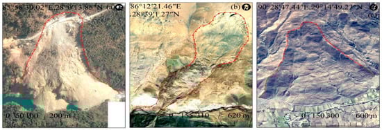 The following are the interpreted characteristics of landslides in the region: (1) There is a substantial tonal distinction between the landslide mass and the surrounding environment and a distinct boundary (Figure 3a). (2) The tone of the landslide mass matches the surrounding environment, but the backwalls, the sidewalls, and the tongue of the landslide are obvious. The sliding source area is recessed, with steep backwalls and bright colors. In addition, the material of a landslide is fragmented and coarse (Figure 3b). (3) After a lengthy period of internal and external force modification, the landslip body has the same color as the surrounding terrain, and a slope gully has formed (Figure 3c).