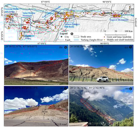 Spatial distribution of landslides and typical the China–Nepal transport corridor. (a) Spatial distribution of historical landslides; (b,c) landslides in the Xainza-Dinggye Rift Basin and on National Highway G219; (d) landslides in the Lazi-Tingri Mountain and on National Highway G318; (e) landslides in the Gyirong and on National Highway G219.