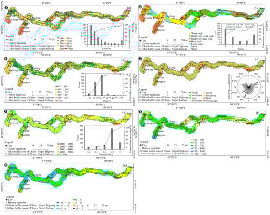 Spatial relationships between historical landslides and influencing factors: (a) fault; (b) lithology; (c) slope; (d) aspect of slope; (e) altitude; (f) precipitation; and (g) temperature.