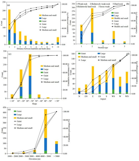 Altitude. The intensity of erosion is related to altitude. Our statistical analysis indicates that as altitude increases, the frequency of landslides increases rapidly and then decreases. They are mainly concentrated in the extremely high mountains, with large fluctuations caused by denudation, erosion, and periglacial processes in the altitude range of 4000 m to 5000 m (Figure 6e), accounting for 80.13% of the total number of landslides, among which the proportions of super-large, large, small, and medium-size landslides were 91.49%, 95.31%, and 87.97%, respectively (Figure 7e). Due to the higher altitude of the Qinghai–Tibet Plateau and the distribution of most faults along the ridges, the geological structure is more fragmented here []. In addition, strong physical weathering occurs in regions at high altitudes. Numerous landslides have occurred in the region as a result of the aforementioned causes. Compared to super-large and large landslides at altitudes below 4000 m, small and medium-sized slides are the most common and are concentrated along highways and secondary valleys.