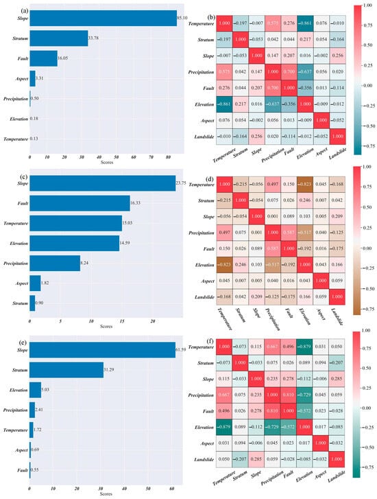 Correlation between landslides and influencing factors. (a) Chi-square test between all landslides and influencing factors; (b) correlation coefficients between all landslides and influencing factors; (c) chi-square test between large and super large landslides and influencing factors; (d) correlation coefficients between large and super large landslides and influencing factors; (e) chi-square test between medium and small landslides and influencing factors; (f) correlation coefficients between medium and small landslides and influencing factors.