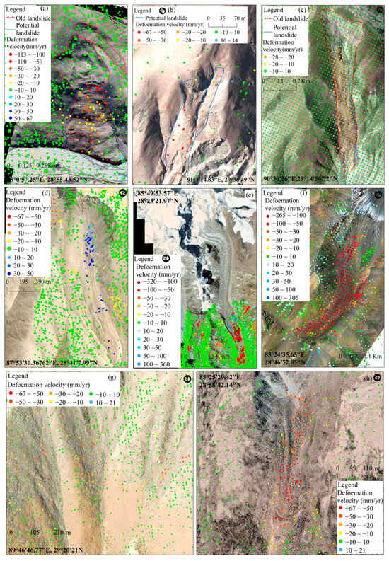 Potential landslides in the area include the local revival of old landslides and new potential landslides. The main characteristics of the local revival of an old landslide are a large number of cracks and scarps on the original fractured landslide mass, the occurrence of slides and collapses, and a bright back wall of the landslide (Figure 10b,d). The main characteristics of a new potential landslide are the fractured rock and soil mass of the slope surface, the steep scarp at the back edge of the slope, the tension crack at the front edge, and the subsidence in the middle of the slope. In addition, gullies have developed on the slope surface, and loose material has gathered in the valley (Figure 10c). Glacier movements are mainly distributed south of Gyirong Town and Nielamu County (in the subtropical monsoon climate zone) within U-shaped troughs at altitudes above 5000 m. The maximum annual surface deformation rate can reach 300 mm. The primary morphology is characterized by striations and tongues with clear boundaries (Figure 10e,f), making them easily distinguishable. Slope weathering layers are distributed across the mountaintops throughout the region. Mainly distributed in periglacial landforms and eroded and denuded extremely undulating alpine landforms. The tops of these slopes are subject to intense solar radiation and significant diurnal temperature variations. After weathering, the rock and soil layers on the slope’s surface experience surface slip, resulting in distinct color differences and rough textures in the images compared to the surrounding features.