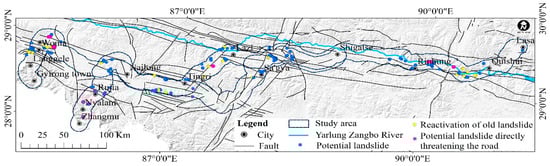 According to the above interpretation signs, 233 potential landslides were identified in the study area, 36 of which were local revivals of old landslides and 187 of which were new potential landslides. The spatial distributions of potential and historical landslides are consistent (Figure 5), and they are geomorphologically concentrated in the Gyirong basin and gorge, the Lazi-Tingri Mountain, Nagarzê Mountain in Shannan City, and the Xainza-Dinggye Rift Basin. There are fifteen potential landslides that pose a direct threat to traffic arteries, primarily in the Renbu Canyon section of the China–Nepal Highway and on both sides of the proposed China–Nepal Railway (Pekucuo to Gyirong County section) (Figure 11).
