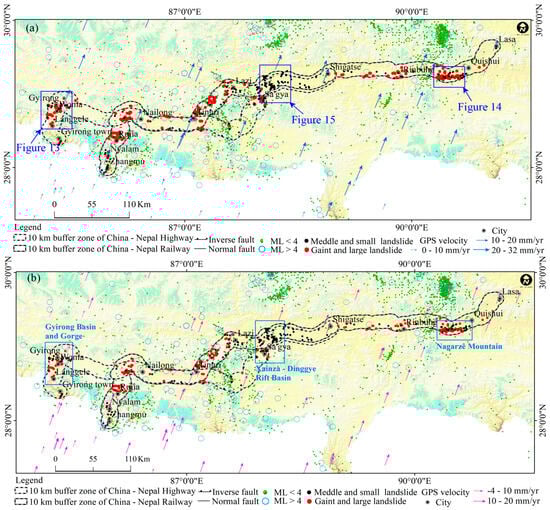 Distribution of historical landslides, tectonic stresses, and earthquakes. (a) GPS rate facing north; (b) GPS rate facing east (data in the figure are from [,]).