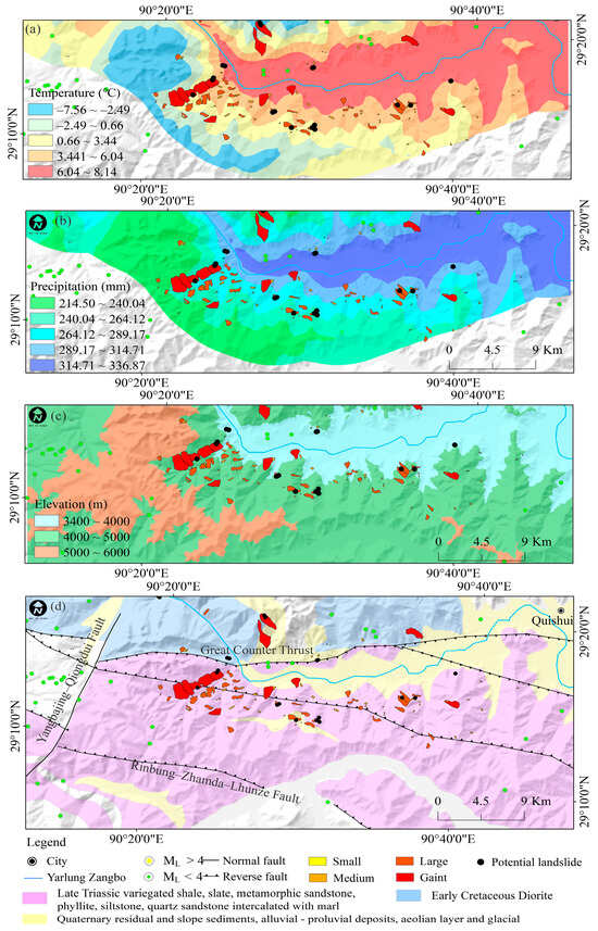 Distribution of landslides in the Nagarzê Mountain. (a) Landslides and temperature; (b) landslides and precipitation; (c) landslides and altitude; (d) Landslides and faults and strata. Xainza-Dinggye Rift Basin.
