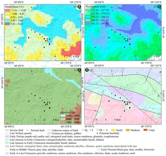 Distribution of landslides in the Xainza-Dinggye Rift Basin. (a) Landslides and temperature; (b) landslides and precipitation; (c) landslides and altitude; (d) Landslides and faults and strata.