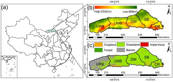 The NFYM is in the northern region of Inner Mongolia, bordering Mongolia, which represents a transitional zone from the Yin Mountain range to the Mongolian Plateau and is characterized by an intricate mix of agricultural and pastoral landscapes. The NFYM encompasses five leagues: Urad Rear Banner (URB), Urad Middle Banner (UMB), Darhan Muminggan United Banner (DM), Siziwang Banner (SB), and Chahar Right Rear Banner (CR) (Figure 1). Predominantly subjected to arid and semi-arid climates, the NFYM experiences an average annual precipitation ranging from 100 to 400 mm. Additionally, the region has an annual average wind speed ranging from 2 to 6 m/s. The majority of the NFYM consists of severely degraded grasslands with a simple ecosystem structure and a weak ability for self-regulation and recovery. Furthermore, the NFYM is highly vulnerable to human interference and natural disasters, possesses poor water resources, and boasts an extremely fragile ecological environment. Moreover, it houses a substantial proportion of wind-eroded sandy land which serves as a primary source of sandstorms, posing a grave threat to the ecological security of North China.