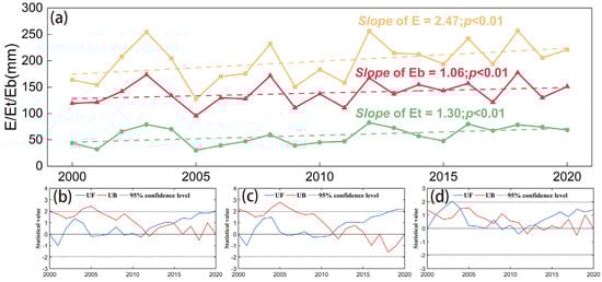 Time trend of E and its components. (a) Time series of E and its components from 2000 to 2020; (b–d) represent the mutation trends of E, Et, and Eb, respectively.