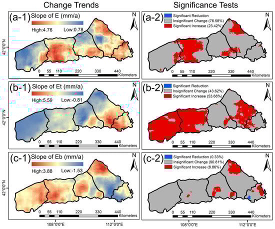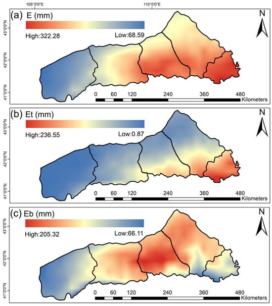 - In time, E (2.47 mm/a, p < 0.01), Et (1.30 mm/a, p < 0.01), and Eb (1.06 mm/a, p < 0.01) all exhibited a significant upward trend. Spatially, the annual mean E decreased from the east (322.28 mm) to the west (68.59 mm), Et increased from the southeast (0.87 mm) to the northwest (236.55 mm), and Eb decreased from the northeast (205.32 mm) to the southwest (66.11 mm).