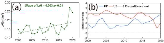 Time trend of LAI. (a) represents the LAI time series from 2000 to 2020; (b) represents the LAI mutation trend.