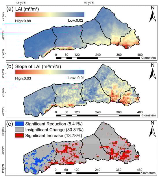 Spatial patterns and significance testing of LAI trends in the NFYM from 2000 to 2020. (a) represents spatial distribution characteristics of the annual average, (b) represents spatial patterns of trend changes, and (c) represents significance tests.