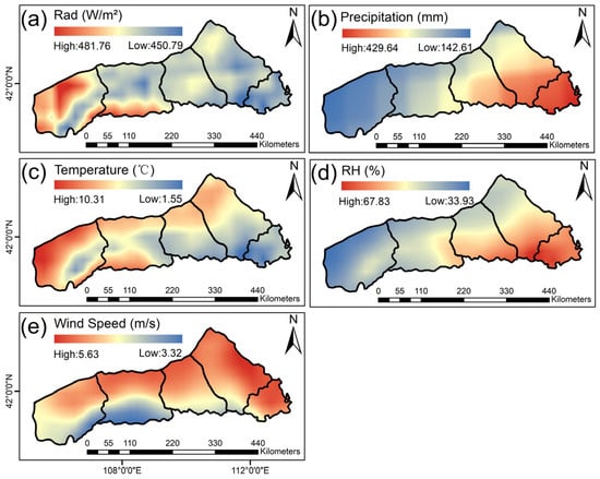 Spatial distribution characteristics of annual average Rad (a), Pre (b), Temp (c), RH (d), and WS (e) in the NFYM from 2000 to 2020.