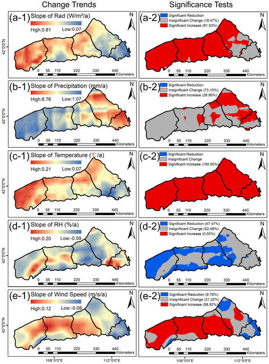The spatial distribution characteristics of annual average meteorological variables are illustrated in Figure 8. Furthermore, Figure 9 displays the spatial distribution of the change rate in meteorological factors along with the results of the significance tests. For Rad distribution, the highest values were found in the northwest of the URB and the southern part of the UMB, reaching a maximum of 481.76 W/m², while the lowest value was 450.79 W/m² (Figure 8a). The change rate ranged between 0.07 W/m²/a and 0.81 W/m²/a, exhibiting an overall decreasing trend from northwest to southeast (Figure 9(a1)). Except for the southeast of SB and the entire CR, significant increases were evident in other regions (Figure 9(a-2)). Pre exhibited substantial spatial variability, decreasing from southeast to northwest, with the highest values in the southeast of the NFYM reaching up to 429.64 mm, while the lowest values in the northwest part being only 142.61 mm (Figure 8b). High Pre areas also witnessed significantly increased change rates, with the highest reaching 8.76 mm/a, gradually decreasing to 1.07 mm/a towards the west (Figure 9(b-1)). The spatial distribution of Temp was closely related to elevation (Figure 9(c-1)), showing a significant increasing trend across the entire study area (Figure 9(c-2)). Average Temp (1.55 °C) and change rates (0.07 °C/a) were lower in the high-altitude mountain ridges, whereas lower elevations exhibited higher temperatures, reaching up to 10.31 °C, with the highest change rate at 0.21°C/a (Figure 9(c-1)). The multi-year average RH decreased from southeast to northwest, resembling the spatial pattern of Pre, ranging between 33.93% and 67.83%, indicating significant differences in humidity between the eastern and western regions (Figure 8d). RH significantly decreased at the northern and southern boundaries of the NFYM (Figure 9(d-2)), with the fastest rate at 0.59%/a. In the high-altitude regions of the URB, UMB, and CR, RH exhibited a slow-increasing trend, peaking at approximately 0.20%/a (Figure 9(d-1)). WS displayed an increasing trend from the southwest to the northeast, ranging between 3.32 m/s and 5.63 m/s (Figure 8e). The northeast part of the URB, the northern part of the UMB, and the southern part of the DM experienced a significant increase at a rate of approximately 0.12 m/s/a, while the northeast part of the SB and the southern boundary of the CR witnessed a notable decrease at a rate of around 0.08 m/s/a (Figure 9(e-1))). In conclusion, despite gradual vegetation recovery due to ecological restoration measures, the NFYM’s vegetation coverage remained relatively low, and effective measures against grassland degradation are still needed. The complex and diverse meteorological environment in the NFYM results from its varied topography, wide lateral span, and spatially diverse meteorological conditions.