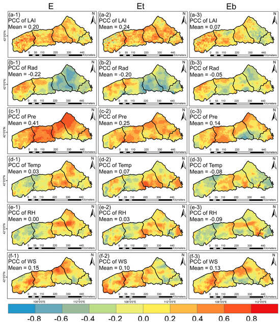 where represents the net partial correlation coefficient (PCC) between x1 and y after eliminating the linear influence of x2 on y, and ry1, ry2, and r12 represent the correlation coefficients between y and x1, y and x2, and x1 and x2, respectively. The magnitude of the partial correlation coefficient serves as an indicator of the strength of the linear association between variables. A larger absolute value signifies a stronger linear correlation, whereas a smaller value suggests a weaker correlation. In this study, partial correlation coefficients were calculated for each driving factor concerning E, Et, and Eb. The computation of spatial scale partial correlation relied on each pixel of the raster image. Calculations were performed for each pixel, where each pixel contained yearly data from 2000 to 2020 for various variables.