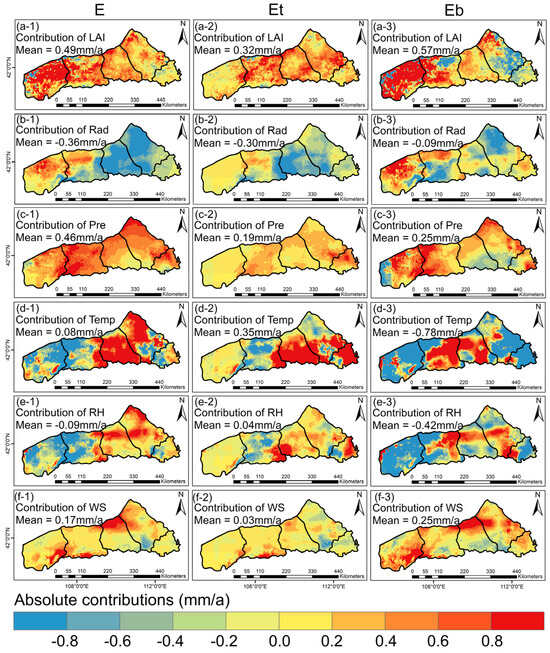 Regarding Eb, LAI has the strongest promoting effect, leading to an increase in Eb at a rate of 0.57 mm/a. Rad, Pre, Temp, RH, and WS—five meteorological factors—exert independent impacts on Eb, with rates of −0.09 mm/a, 0.25 mm/a, 0.78 mm/a, −0.42 mm/a, and 0.25 mm/a, respectively (Figure 11c). Meteorological factors exhibit complex interplay governing Eb. Firstly, for Rad, heightened irradiance typically energizes water molecules, facilitating liquid-to-vapor phase shifts and enhancing evaporation. However, Rad suppressed Eb in southern UMB and northern SB, feasible under certain conditions; intense radiation at high Temp and low RH can prompt evaporation rates surpassing moisture supply, depleting surface water and suppressing vaporization. Secondly, Pre constitutes the primary water source, with greater rainfall providing more moisture for evaporation. Pre directly replenishes the land surface, furnishing ample water through soil wetting to sustain evaporation processes. Notably, the most pronounced inhibiting effect is associated with Temp, which contrasts with the conventional assumption that higher temperatures lead to greater Eb. In the arid region of the NFYM, this unexpected outcome may stem from soil moisture limitations; even with elevated temperatures, there might not be a sufficient water supply to support extensive surface water vapor evaporation. Regarding RH, our explanation for its negative contribution to Eb is that lower RH restricts the conversion of water from the liquid to the gas phase. Water molecules are less likely to transition to the gas phase under lower humidity, consequently reducing surface water vapor evaporation. High WS can enhance the diffusion of water vapor from the land surface into the atmosphere, thereby promoting surface water vapor evaporation.