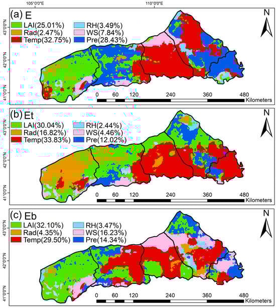 The spatial distribution of dominant factors influencing E, Et, and Eb over the NFYM is depicted in Figure 12. As shown in Figure 12a, Temp emerged as the dominant factor for E, covering 32.75% of the study area. It was primarily concentrated in the southern part of the DM and the northeastern portion of the SB. E driven by Pre dominated over 28.43% of the area, scattered across the UMB with concentrations in the southern SB and northern CR. Regions where LAI governs E changes were mainly situated in the URB, accounting for 25.01% of the study area. The remaining variations in E were primarily influenced by WS (7.84%), Rad (2.47%), and RH (3.49%). Figure 12b illustrates the dominant factor distribution for Et. Temp dominated in regions predominantly situated in the southern DM and southeastern CR, constituting the highest proportion at 33.83%. Et controlled by LAI covered 30.04% of the study area, primarily concentrated in the northern and eastern parts of the NFYM. Rad exerted dominance over 16.82% of the area, primarily located in the northwestern URB. Pre’s dominant areas were scattered and accounted for 12.02%. The influences of WS and RH were smaller, encompassing 4.46% and 2.44% of the area, respectively. From Figure 12c, it was evident that the primary dominant factors for Eb were LAI and Temp, covering 32.10% and 29.50% of the study area, respectively. Areas where WS dominates comprise 16.23% of the total, scattered across the DM, SB, and CR. Pre governed 14.34% of the area, while Rad (4.35%) and RH (3.47%) had relatively smaller controlling influences.