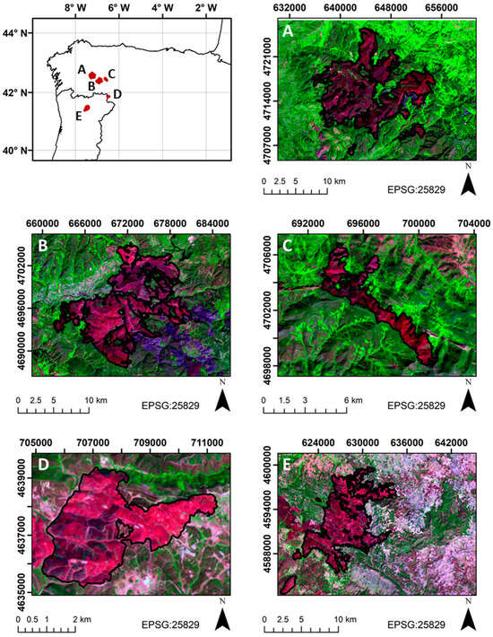 Location of the Courel (A), Valdeorras (B), Valdueza (C), Figueruela (D) and Vila Real (E) wildfires in the northwestern Iberian Peninsula (Portugal and Spain). The background image is a Landsat-8 false color composite (R = band 7; G = band 5; B = band 4).