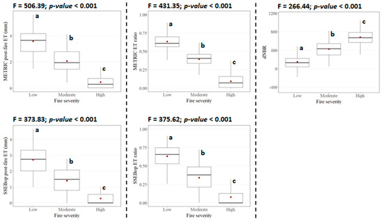 Boxplots depicting the relationships between ET estimates and dNBR index, and fire severity. We also show one-way ANOVA results. Lowercase letters denote significant differences between fire severity categories at the 0.05 level.