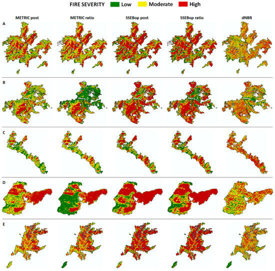 Predicted fire severity categories through ET estimates and the dNBR index for Courel (A), Valdeorras (B), Valdueza (C), Figueruela (D) and Vila Real (E) wildfires.