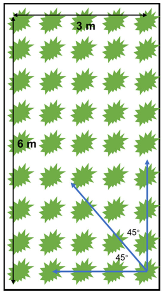 was measured by the SunScan plant canopy analyzer (Produced by Delta-T in the UK), which consists of a 1 m probe and a handheld PDA. The probe contains a total of 64 quantum sensors and is connected to the PDA using an RS-232 cable. When measuring the of each plot, the incident light and effective radiation were measured separately for 3 canopy incident (), 3 canopy reflectance (), 3 soil incident (), and 3 soil reflectance measurements () of photosynthetically active radiation (PAR). The of the plot was obtained by averaging these three measurements. The spatial relationship between the probe and the winter wheat plots is shown in Figure 2. Due to the time-consuming nature of observations, to ensure that all measurements were completed between 10 a.m. and 2 p.m., only one replicate experiment for each water treatment was selected for ground data collection, resulting in a total of 77 ground plot measurements per session. The horizontal angle between adjacent measurements was set to 45°. The of each plot is defined as: