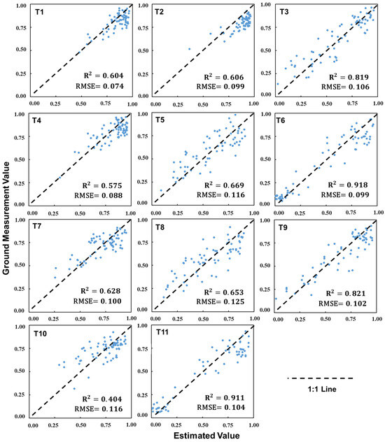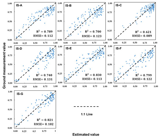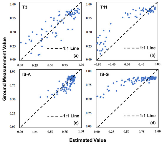 The measurement of canopy reflectance and could not be completed due to insufficient emergence of T3 and T5 varieties in some plots and the inability to measure IS-F and IS-G in all plots on 11 April and 18 April due to irrigation. However, the measurements from all other plots were included in the accuracy validation. Figure 3 shows the relationship between the estimated values calculated using Equation (3) and the ground truth measured values, where the horizontal axis represents the estimated values and the vertical axis represents the measured values.