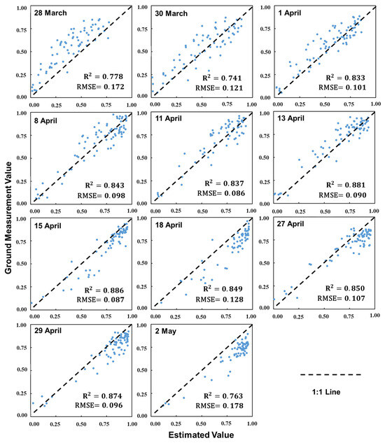 When estimating the vegetation index , the changing light conditions during crop growth, including solar zenith angle and light intensity under different weather conditions, play a crucial role in determining the stability of the correlation between the vegetation index and . These light conditions include solar zenith angle and light intensity under different weather conditions, which can affect the correlation between and other indicators. Therefore, when using MNDVI to estimate , it is necessary to validate the accuracy of this index on different observation dates. To validate the estimation accuracy of MNDVI on different observation dates, we calculated the corresponding estimated values using Equation (3). These estimates represent the at different observation dates. Our study aims to demonstrate the high stability of using MNDVI for estimation during different phenological stages and under varying light conditions. The accuracy validation results are shown in Figure 4, which contributes to evaluating the applicability of this method under different environmental conditions.
