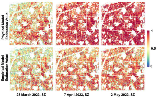 Ground experiments have shown that MNDVI has a stable ability to retrieve , with minimal influence from variations in light conditions, crop varieties, and growth differences, enabling its application in large-scale retrieval. However, further experiments are needed to verify its accuracy at the satellite scale. Therefore, in this study, three cloud-free 10 m Sentinel-2 images of the SZ during the critical growth stages of winter wheat were selected for accuracy validation. The validation area was chosen as a 1000 ✕ 1000 pixel (10 ✕ 10 km) region, with non-winter wheat areas masked out. All winter wheat pixels in this region were used for validation. The calculated using the Biophysical Processor tool in SNAP 9.0.0 software was used as the ground truth data to verify the reliability of the data obtained from Equation (3). Figure 6 shows the results of the comparison between the actual and the estimated during the critical phenological stages. The coefficients of determination for the three stages were 0.718, 0.550, and 0.578, with the lower coefficient in the later stage possibly due to the higher values. However, overall, the estimated values were lower than the actual values, indicating a certain underestimation phenomenon in this method, which may be caused by vegetation index saturation in the later stages.