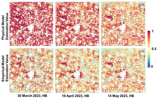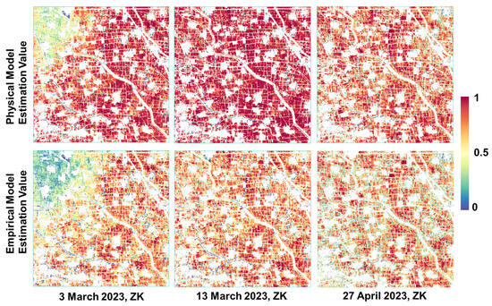 In this study, we compare the ability of satellite-scale physical models and the empirical model obtained in this research to retrieve winter wheat in the southern and eastern parts of the North China Plain, specifically in ZK and Huaibei HB. The values of the two models were calculated based on Sentinel-2 images during the critical phenological period of winter wheat, and the results are shown in Figure 7 and Figure 8. In ZK, the determination coefficients of the values estimated by the two models were 0.9003, 0.7818, and 0.6534, while in Huaibei, they were 0.6929, 0.7183, and 0.8312. It can be seen that even at the satellite scale, the estimated based on MNDVI and the physical model still have a good correlation in different regions and under different planting conditions, further demonstrating the universality of estimating based on MNDVI.