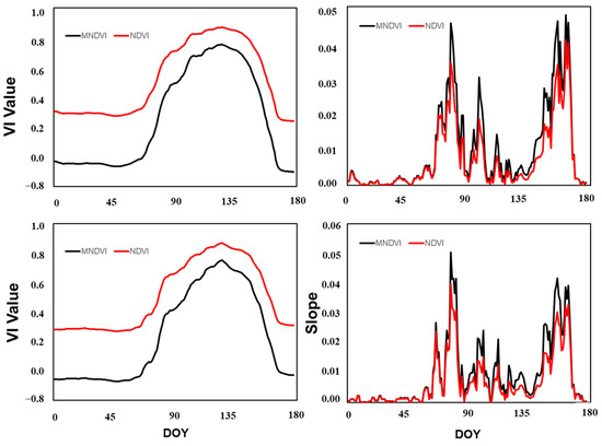 In the current study, in the light use efficiency model is often calculated based on NDVI, for example in EC-LUE [35] where . This study believes that MNDVI may have greater advantages; therefore, we compared the two vegetation indices and analyzed the response differences in winter wheat growth during the winter wheat growing season. Therefore, we compared it with NDVI to analyze the differences between the two vegetation indices during the growth process of winter wheat. The current study indicates that NDVI shows saturation in estimating during the peak growth period of crops [36], making it difficult to estimate accurately. Therefore, based on the MODIS daily reflectance data product (MCD43A4), we compared the variations of pure winter wheat pixels in the North China Plain from 1 January to 30 June to analyze the saturation status of the two vegetation indices. Figure 10 shows the time series curves of NDVI and MNDVI after being filtered by a moving average window of size 5, as well as the absolute values of their slopes during different periods.